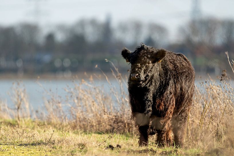 Een Galloway in rustig winterlicht aan de waterkant.