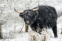 in de winter in het bos is er een Galloway in de sneeuw met grote horens