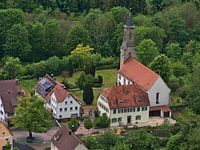 Luchtfoto van het idyllische dorpje Honau, dat deel uitmaakt van de gemeente Lichtenstein in Baden-Württemberg, Duitsland, in de Schwäbische Alb met de historische Galluskerk in het voorjaar, omgeven door groene bomen.