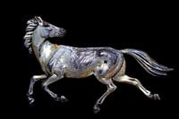 Galopperend paard is een serie van drie, maar kan ook als afzonderlijke beeld gezien worden. Een zilverkleurige paard op een zwarte achtergrond.