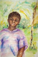 Gambiaans jongetje geschilderd met aquarel. Ik kwam hem tegen toen ik in Gambia aan het wandelen was, hij keek me zo lief aan dus gauw maar een foto gemaakt zodat ik hem kon schilderen.