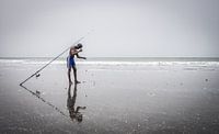 Gambiaanse visser bekijkt zijn vangst. Door het dunne laagje water op het strand ontstaat er een mooie weerspiegeling van de man.
