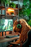 Midden in een groene oase zit een wezen dat gaming en natuur op fascinerende wijze combineert. Met zijn volumineuze, harige hoofd en gloeiende koptelefoon ziet het eruit als de ultieme gamer - een creatief dier dat opgaat in de digitale wereld. De harmonieuze planten omringen hem als een decor van avontuur.