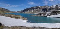 De Gamle Strynefjellsvei is een oost-west weg over het Noorse gebergte. De nieuwe weg gaat door tunnels maar de oude weg, hier afgebeeld gaat boven over de pas. Zelfs midden in de zomer ligt hier nog sneeuw.