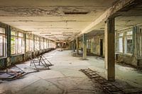 Verval in de mooiste vorm. Deze benedenverdieping van een groot complex bevat eigenlijk alleen nog maar ruwbouw. Toch zit er nog genoeg detail in, dit komt vooral door het afgebladerde verfwerk en de structuur in de vloer.