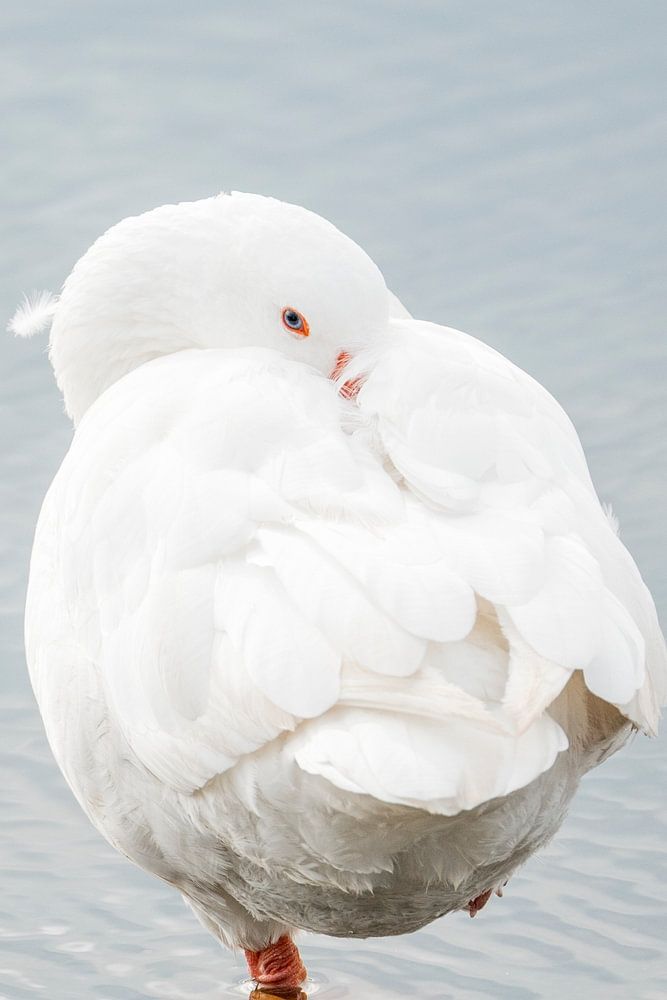Deze poëtische foto toont een witte gans die rust op één poot, haar kop diep weggeborgen in haar pluizige verenkleed. Het spiegelende water verdubbelt haar vorm en versterkt de stilte en symmetrie van het moment. De oranje poot en scherpe oog zorgen voor subtiele accenten in een verder monochroom en dromerig palet. Een beeld dat rust, balans en natuurlijke elegantie uitstraalt — perfect voor een kalmerende wanddecoratie.