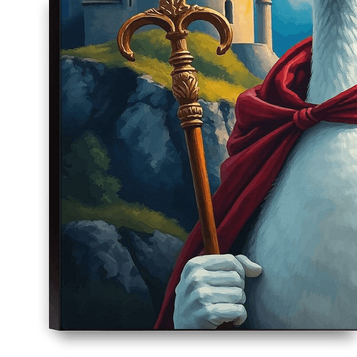 Een vorstelijke gans loopt zelfverzekerd rond, versierd met een glinsterende gouden kroon boven op zijn kop, terwijl een majestueuze koningsstaf voor een autoritaire uitstraling zorgt. Achter deze nobele vogel verrijst een groots kasteel met stenen torens en kantelen die naar de hemel reiken. Het tafereel straalt een grillige mix van…