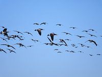 Een troep ganzen nadert over Ahrenshoop aan de Darß in Duitsland.