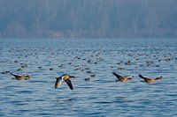 Een groep ganzen die over het water vliegt met in de achtegrond honderden smienten