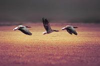 drie prachtige ganzen die samen een vlucht maken over het boeren Hollandse landschap. Ze vliegen bijzonder synchroon.