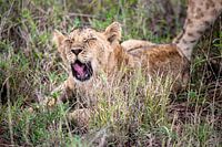 Uiteindelijk ben ik erin geslaagd precies deze unieke sfeer van wilde dieren vast te leggen. Hier zie je een geeuwende baby leeuw.