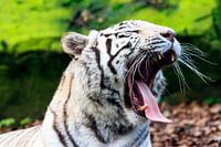 Prachtige close up opname van een witte tijger, de witte variant van een Bengaalse tijger (Panthera tigris tigris), die gaapt met zijn bek wijd open