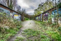 Verlaten garageboxen in het Belgische Doel. De vervallen garages zijn voorzien van graffiti en er is veel groen onkruid. Dit alles geeft een rauwe sfeer, waardoor het in combinatie met een donkere wolkenlucht, een pakkende Urbex foto is.
