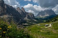 Bloemen bloeien op de ranken van het prachtige berglandschap van de Italiaanse Dolomieten in Zuid-Tirol met groene weides en massieve rotsformaties die imposant boven het landschap uit reiken.