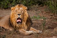 Garen, rode mond en tong. Een krachtige mannelijke leeuw met een prachtige manen ligt indrukwekkend  van Michael Semenov