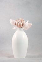 Sfeervol stilleven in zachte pastelkleuren met knoflook als bloem.