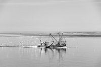 Een garnalenkotter op de Waddenzee voor de kust van Ameland Met een mooie spiegeling in het water.