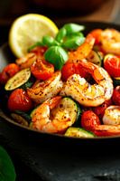 Een heerlijk feest van kleuren en smaken komt samen in deze kunstig bereide pan. Sappige garnalen, verleidelijke kerstomaatjes en verse courgettes worden afgemaakt met een vleugje basilicum. Deze smakelijke compositie brengt mediterrane charme in elke keuken en nodigt uit tot koken en genieten.
