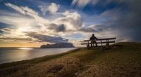 Man op de bank bij Gasadalur dorp en Mykines Eiland in zonsondergang, Faeröer Eilanden