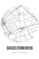 Zwart-witte landkaart, stratenplan of plattegrond van Gasselternijveen. Gasselternijveen is gelegen in de gemeente Aa en Hunze, provincie Drenthe. Op de stadskaart zijn alle openbare wegen in Gasselternijveen opgenomen. Verder is de kaart voorzien van de coördinaten van het centrum van Gasselternijveen.