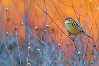 Gaszanger (Cisticola juncidis) in Italië. Zittend in lage vegetatie met een zonsopkomst verlichte achtergrond.