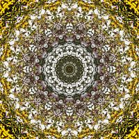 Een hypnotiserend caleidoscopisch beeld in de kleuren geel en wit en een vleugje roze, gebaseerd op een foto van een tak van een magnolia in april
