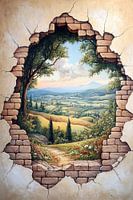 Gateway to Serenity - Dit landschap schilderij toont een idyllisch, glooiend platteland gezien door een gebarsten, stenen muuropening, verrijkt met levendige bloemen en bomen op de voorgrond tegen een achtergrond van zachte heuvels en een kleurrijke zonsondergang.