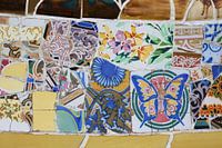 Abstracte kunst. Kleurrijke mozaïeken, wandtegels met vlinders en bloemmotieven op oude tegeltjes van keramiek in park Parc Guell, Barcelona, Spanje. Kunstwerk van de beroemde kunstenaar en architect Antonio Gaudi. Zijn stijl wordt gekenmerkt door Art-Nouveau, Jugenstil en Catalaans modernisme.