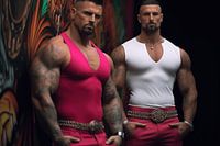 Een explosie van creativiteit en kracht straalt af van deze unieke AI-gecreëerde portretten! Je wordt direct meegezogen in een dynamisch tafereel waar gespierde mannen elkaar ontmoeten in een sfeervolle steeg. De kleurrijke graffiti op de muren vertelt een eigen verhaal, met patronen en beelden die energie en stedelijke rauwheid…