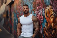 Een explosie van creativiteit en kracht straalt af van deze unieke AI-gecreëerde portretten! Je wordt direct meegezogen in een dynamisch tafereel waar gespierde mannen elkaar ontmoeten in een sfeervolle steeg. De kleurrijke graffiti op de muren vertelt een eigen verhaal, met patronen en beelden die energie en stedelijke rauwheid uitstralen. Het samenspel tussen de ruige, gespierde lichamen en de levendige kunst op de achtergrond creëert een spannend contrast dat zowel visueel boeit als emotioneel prikkelt.