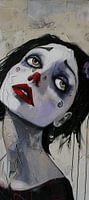 Gaze Ascend - Dit vrouwen schilderij toont een expressief portret van een vrouw met opvallende, bijna theatrale make-up en een doordringende blik. Haar gezicht, groot afgebeeld, vult bijna het gehele canvas. De vrouw heeft grote, breed opengesperde ogen die naar boven zijn gericht, waardoor een intense en enigszins dromerige expressie wordt gecreëerd. Haar huid is bleek met een lichtblauwe tint en contrasteert sterk met haar donkere, gestileerde wenkbrauwen en de dramatisch rode lippen, waarvan de ene hoek omhoog is gekruld in een subtiele glimlach. Op haar wang zien we een speelse, krullende rode lijn, die echo's oproept van tranen of clownsschmink. Haar zwart haar valt in strakke, glanzende lokken rond haar gezicht, met aan één zijde een paars bloemetje als verfijnd detail. Op de achtergrond is gebruik gemaakt van gedempte beige en grijstinten, waarbij de ruwe penseelstreken en krassen op het canvas een diepte en textuur geven die haast voelbaar zijn. Dit expressionistische portret schilderij, boeiend en emotioneel geladen, spreekt van een verhaal dat dieper gaat dan wat alleen het oog ziet.
