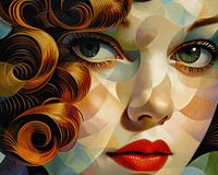 Kijkend naar detail zie je hoe subtiele kleurvlakken de huid rondom de ogen zacht modelleren: licht gebroken tonen, vloeiende overgangen die de oogkas en wenkbrauw ondersteunen. Aan de rand geven de krullen contrasterende donkere spiralen die het beeld aarden. Dit is een schilderij vrouw waarin de keuze voor opvallende ogen en monumentale krullen geen toevalligheid is — het is een opzettelijke dialoog tussen kijken en verschijnen, tussen innerlijk register en uiterlijke versiering. En als je het zo leest, voelt het alsof het schilderij zachtjes zegt: houd even vast — hier gebeurt iets tussen haar enhaarblik.