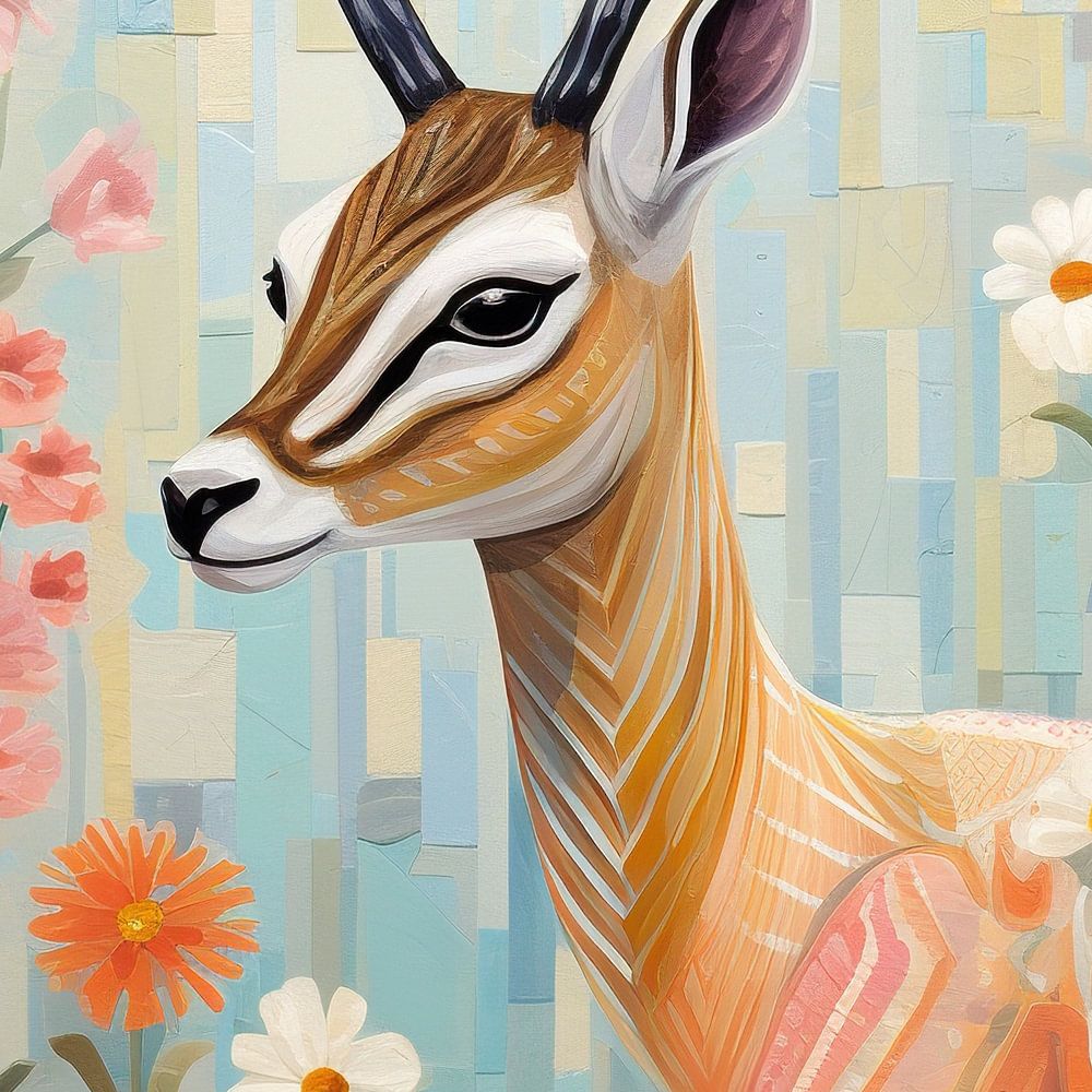Gazelle | Natuurlijk Portret - Op dit vrolijke doek zien we een statige gazelle, omgeven door een levendige flora van roze en witte bloemen tegen een achtergrond van zacht pastelblauwe en beige geometrische vormen, een charmante vermenging van natuurlijke schoonheid en gestileerd design.