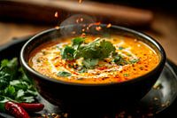 Een dampende, gouden soep vol intense smaken straalt warmte en gezelligheid uit. Verse kruiden en helderrode chilivlokken voegen smakelijke accenten toe. Deze visuele delicatesse is perfect voor in de keuken, waar het de liefde voor koken en het plezier van eten viert.