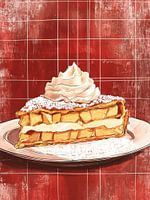 Een royale plak huisgemaakt appelgebak met poedersuiker, op een klassiek wit bord tegen een robuuste rode tegelachtergrond. Deze warme, uitnodigende tekening straalt troost en traditie uit.