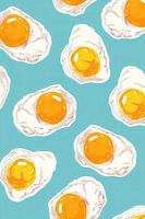 Dit levendige patroon van gebakken eieren op een lichtblauwe achtergrond voegt plezier en kleur toe aan elke keuken. Ideaal voor kookliefhebbers of als humoristisch element in een modern huis. Perfect voor keukenposters of als vrolijke muurdecoratie.