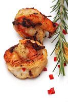 Gebakken koningsgarnalen met rozemarijn, knoflook en kruiden op een witte achtergrond.