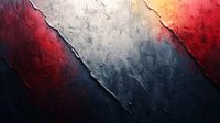 Dit trendy kunstwerk is een intrigerend samenspel van texturen en kleuren, waarbij dieprood, grijs en zwart in elkaar overlopen door middel van scherpe lijnen die de afzonderlijke kleurvlakken scheiden.