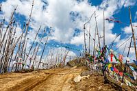 Rijk gekleurde gebedsvlaggen wapperen in de wind op de top van een berg (Chelela Punt) in centraal Bhutan, Azië