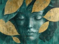 Details: vrouwen schilderij, natuur schilderij, serene kunst, groene kunst, bladeren, gezicht, verguld, rustgevend, artistiek, organisch