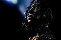 Deze foto toont een vrouw met een mysterieuze en intense uitstraling. Haar gezicht is gedeeltelijk verborgen achter nat of verward haar, dat in losse strengen over haar ogen en wangen valt. De belichting is dramatisch en speelt met sterke contrasten tussen licht en schaduw, waardoor haar gelaatstrekken deels worden geaccentueerd en…
