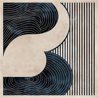 Dit werk brengt een stijlvolle harmonie van gebogen lijnen en strakke strepen samen, waarbij diepblauwe en natuurlijke beige tinten elkaar afwisselen. De golvende patronen herinneren aan de ritmische beweging van golven, terwijl de verticale strepen zorgen voor een gestructureerde balans. De subtiele kleurovergangen en de combinatie van ronde en rechte vormen creëren een gevoel van beweging en rust tegelijkertijd. Deze afbeelding zou perfect zijn voor een ruimte die een moderne esthetiek met klassieke elementen wil combineren.