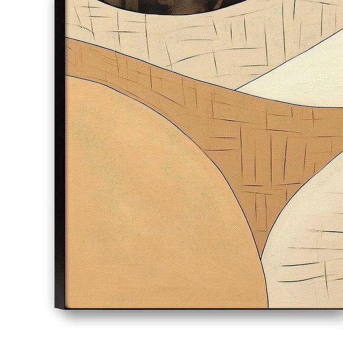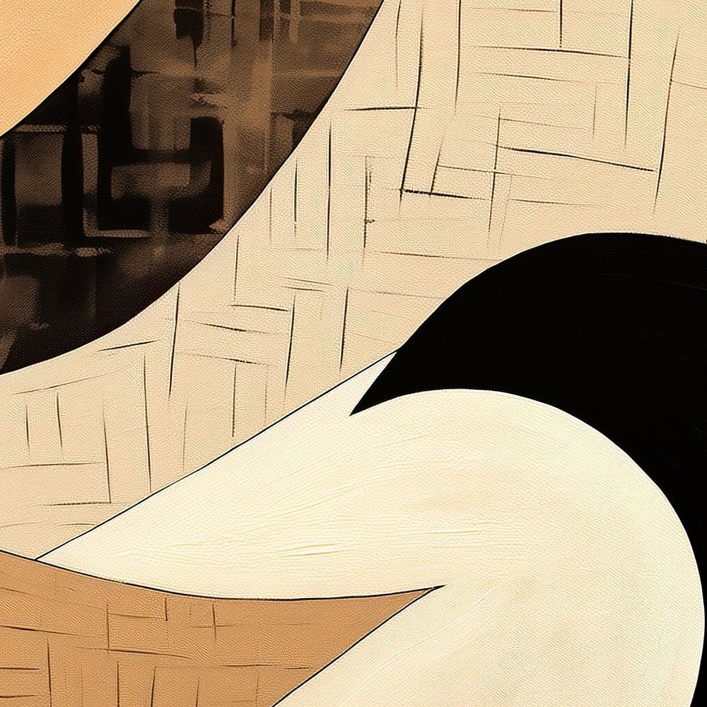 Gebogen Stilte - Dit schilderij vertoont een abstracte compositie met gebogen en organische vormen, gescheiden door strakke lijnen, wat een dynamisch evenwicht creëert. De kleuren zijn ingetogen met een zacht palet van beige en bruin, contrasterend met zwart, wat een rustgevende maar krachtige uitstraling geeft. Textuur lijkt door de verflagen heen subtiel aanwezig, wat een extra dimensie toevoegt aan het stuk.