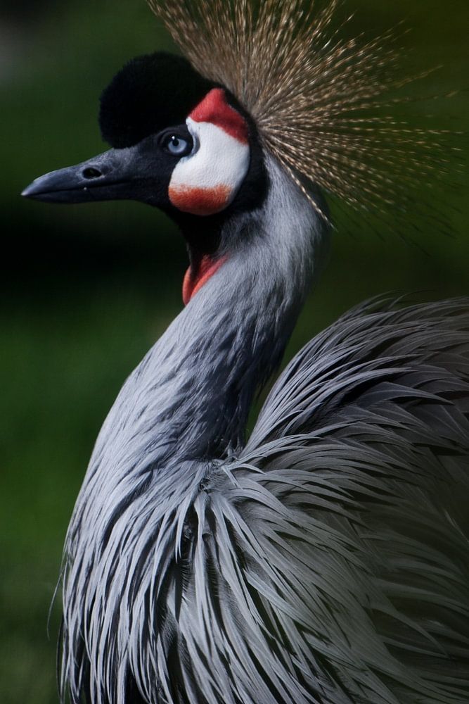 Gebogen nek van een gekroonde kraanvogel op een donkergroene achtergrond Afrikaanse vogel in profiel