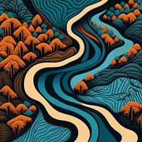 Gebogenes Tal zeigt eine faszinierende, stilisierte Interpretation eines Flusses, der sich durch eine üppige, topografische Landschaft schlängelt. Die Komposition wird durch schwungvolle Kurven und starke Kontraste bestimmt, die ein abstraktes, aber eindeutig organisches Terrain schaffen, das sowohl Gelassenheit als auch visuelle…