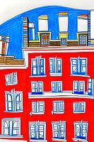 Kleurige printen, abstract, figuratieve illustraties met afbeeldingen van huizen, grachtenpanden uit diverse landen en steden.