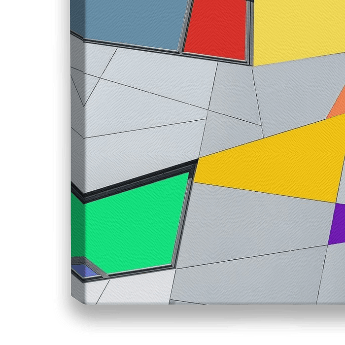 Een gebouw met gekleurde vlakken die verschillende vormen hebben.