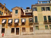 Oude gebouwen met balkon en luiken in Venetië in groen en oranje. Blauwe lucht.