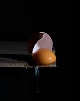 een gebroken ei op een houten plank