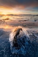 Een dun laagje ijs wat gebroken is rondom een rots langs de mooie zuid kust van Zweden tijdens een prachtige zonsopkomst. Foto is genomen een koude ochtend in de winter.